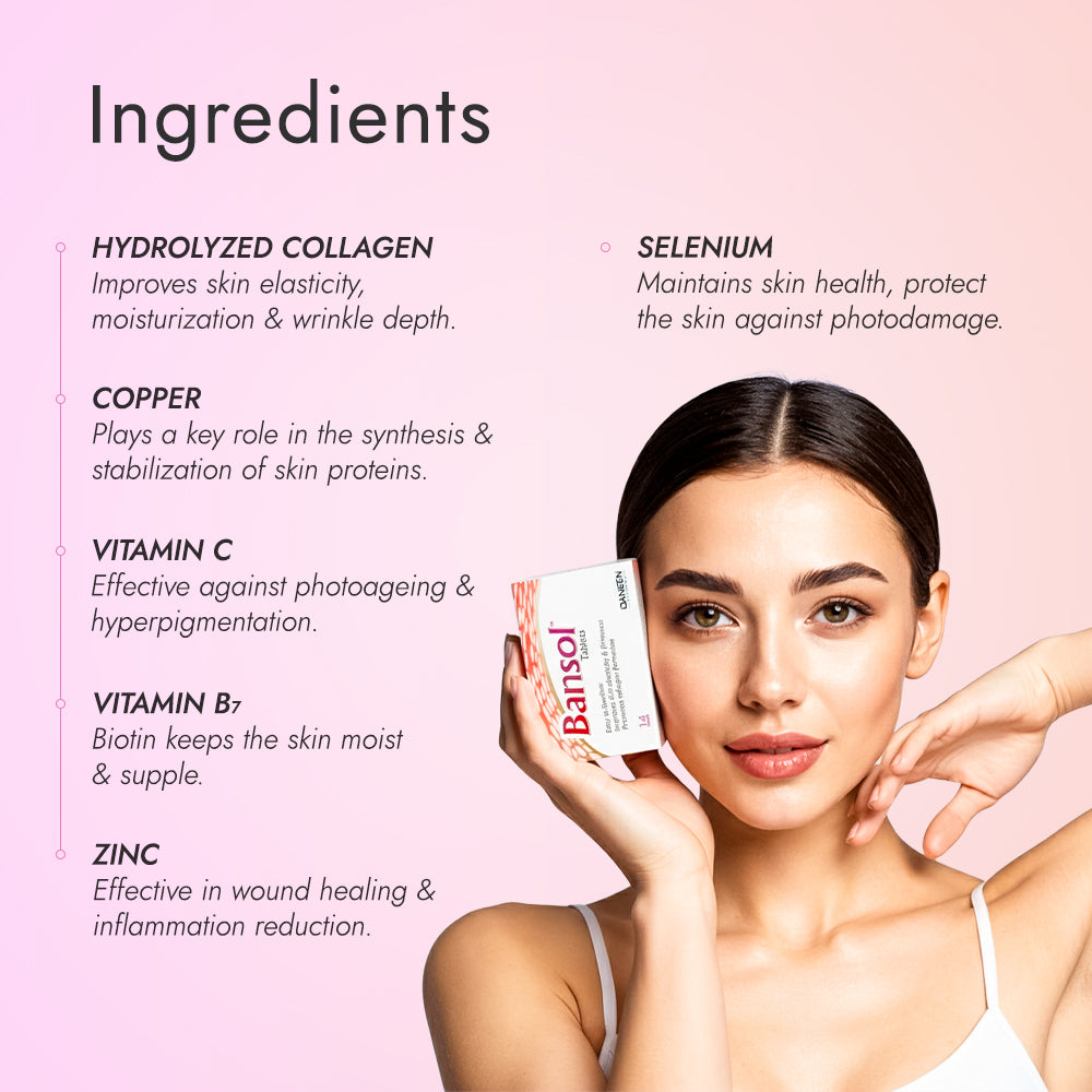 Bansol Tablets are made with natural collagen and essential nutrients that support healthy skin, strong hair, and nails.