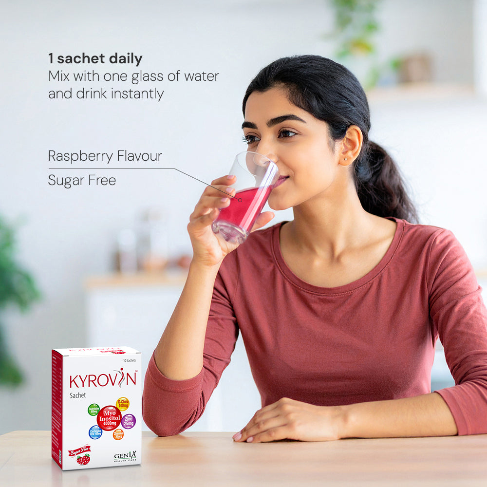 Kyrovin Sachets provide complete daily nourishment for women managing hormonal fluctuations or PCOS-related concerns — in a pleasant-tasting, easy-to-drink sachet form.